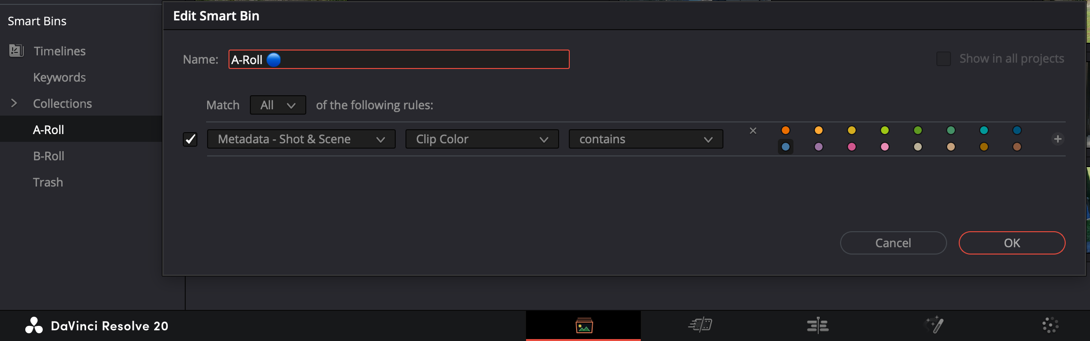 Metadata Shot & Scene->Clip Color->contains->Blue. - Create another Smart Bin named B-Roll. Set the rule: