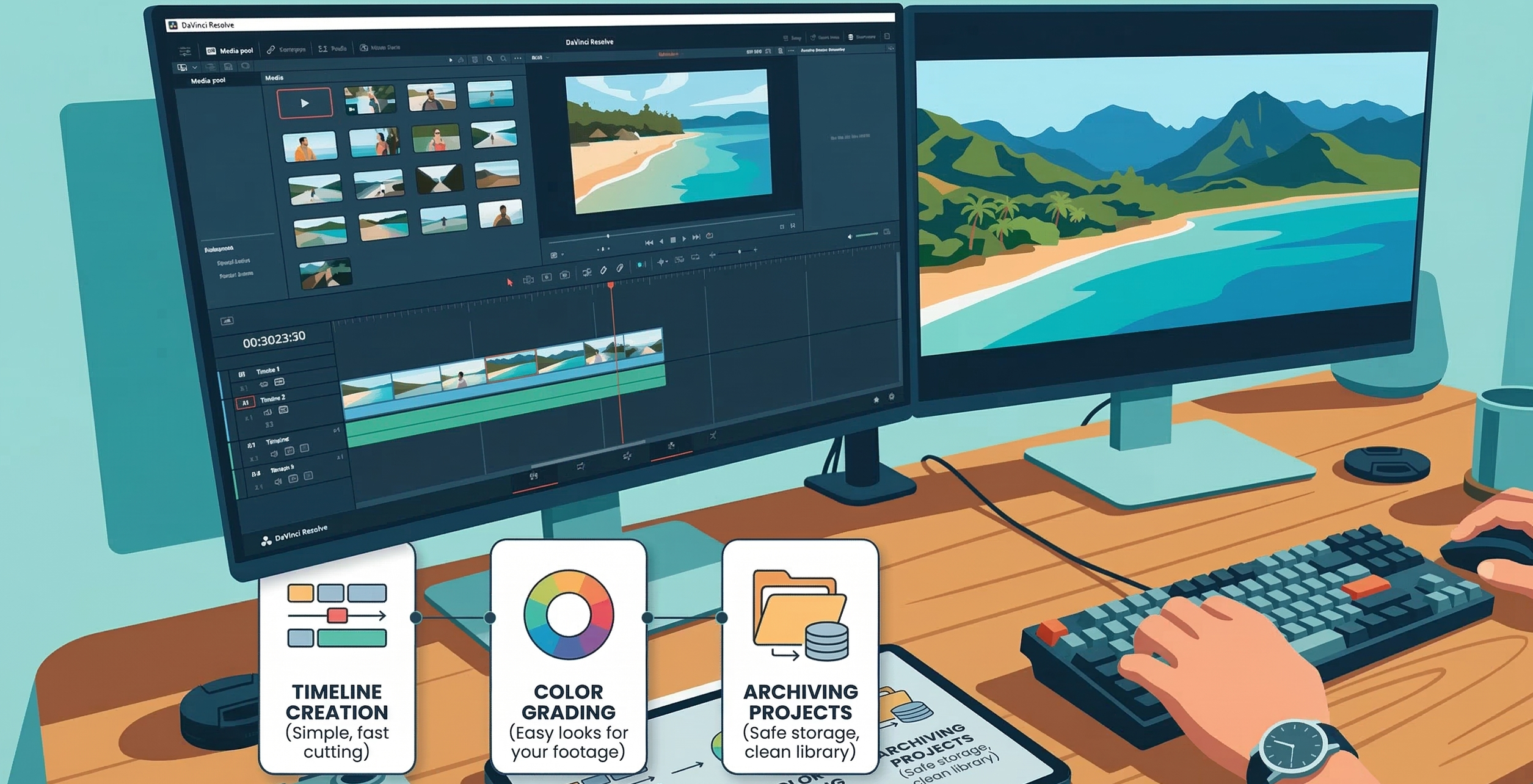DaVinci Resolve is a powerhouse for video editing, but it can quickly become overwhelming when all you want to do is cut together some nice holiday videos. If you’re like me, you probably just want to piece together those precious memories from your phone or drone without getting bogged down in complex Hollywood workflows. Here are three of my main workflows that keep things manageable, fast, and still look great: Timeline Creation, Color Grading, and Archiving Projects.